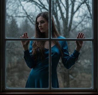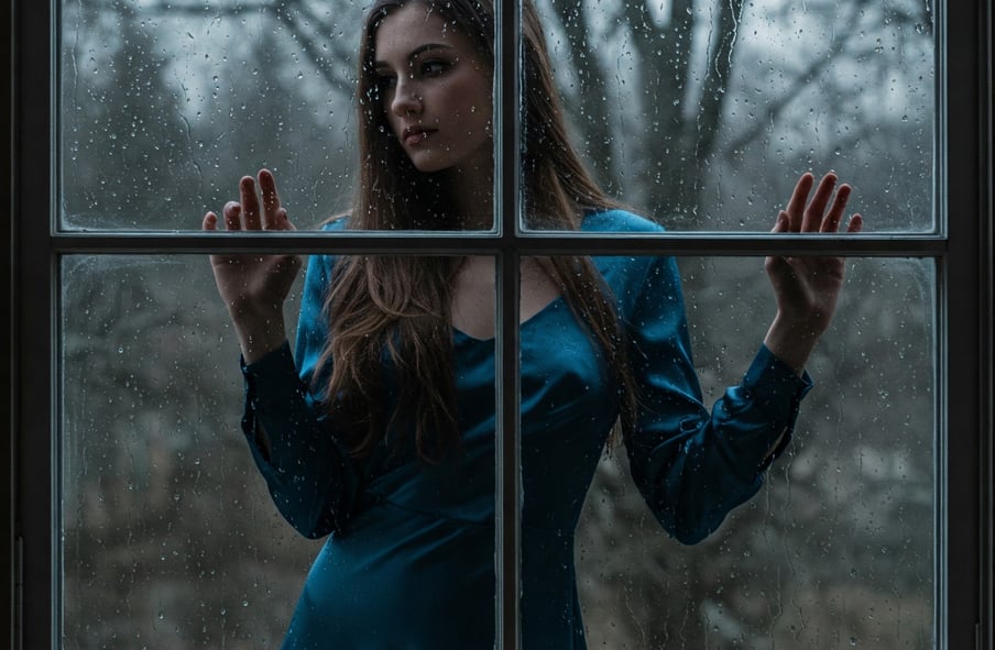 El cristal empañado era un velo grisáceo que difuminaba el mundo exterior, transformando los árboles desnudos en espectros danzantes bajo la lluvia persistente. Mariana, con su vestido de seda azul noche ondeando suavemente a su alrededor como un recuerdo líquido, apoyó la frente en el frío vidrio. La ventana, con sus cuadrículas, parecía dividir no solo el paisaje, sino también los fragmentos de su propia memoria. Cada gota que resbalaba lentamente era un suspiro del pasado, una nota solitaria en la sinfonía silenciosa de la tarde.